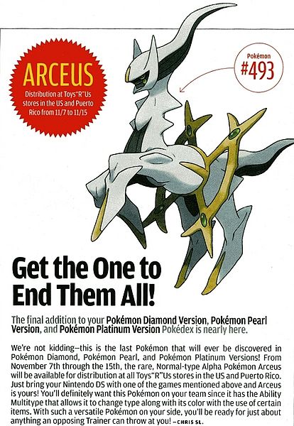 A recent article in Nintendo Power announced the final Pokémon that will be available for download for Pokémon Diamond, Pokémon Pearl, and Pokémon Platinum at Toys "R" Us.