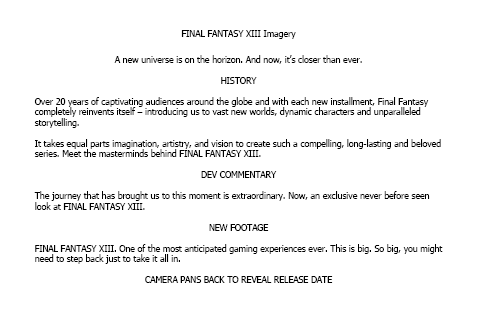 A recent casting call held by Liz Paulson Casting in Los Angeles is requesting someone to read a developer commentary script that will dub over the reveal of "an exclusive never before seen look at Final Fantasy XIII." The trailer will also feature a panning camera that closes with the release date.